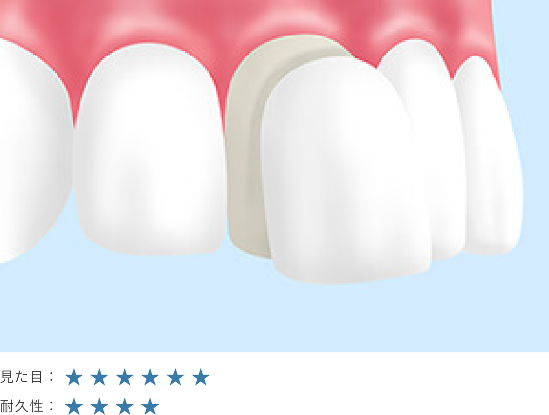 前歯の表面を薄く削り、つけ爪のような薄いセラミックの板を貼りつける処置です。前歯を削らなければなりませんが、ホワイトニングできない歯も白くでき、形も整えられます。